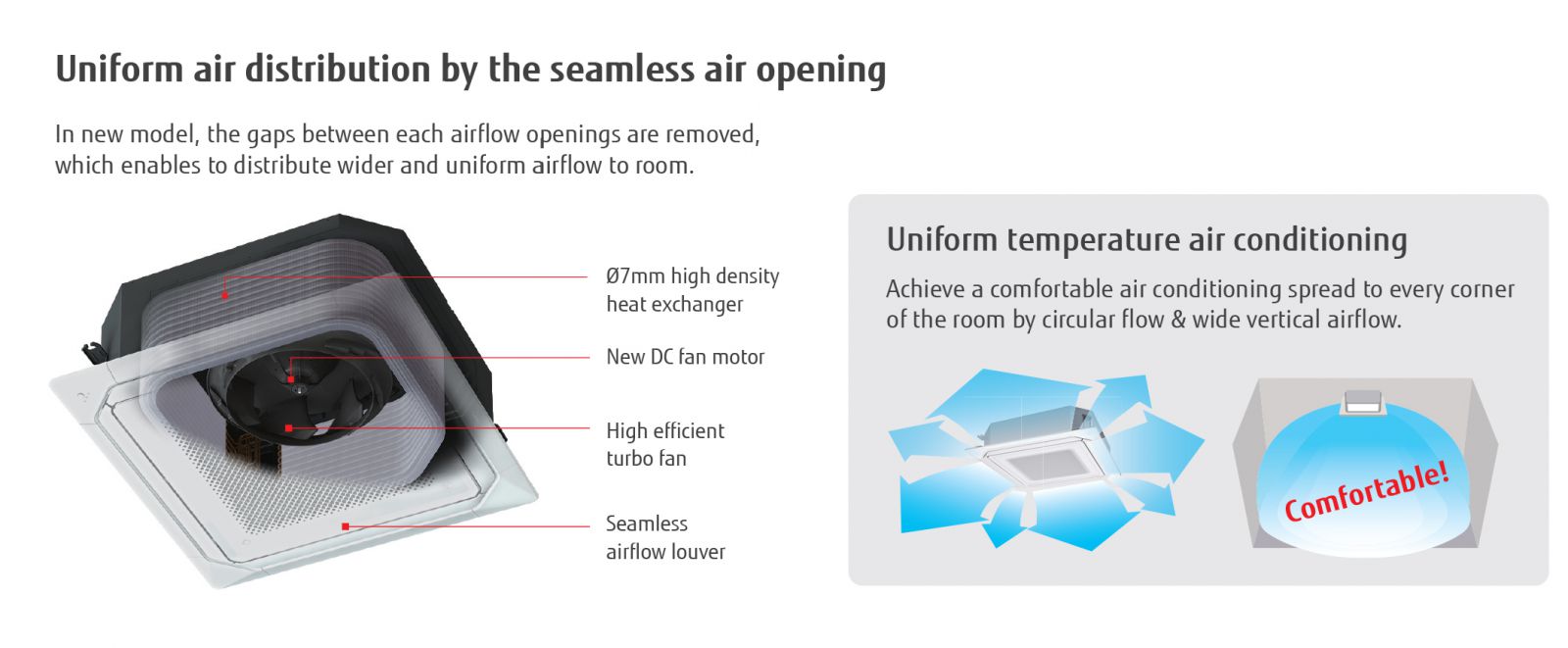 Loại dàn lạnh Cassette âm trần đa hướng thổi có mặt đầu tiên trên thị trường Nhật, tạo ra hướng thổi 360° mang lại khả năng phân bố nhiệt độ tốt hơn tạo ra 1 môi trường thoải mái.