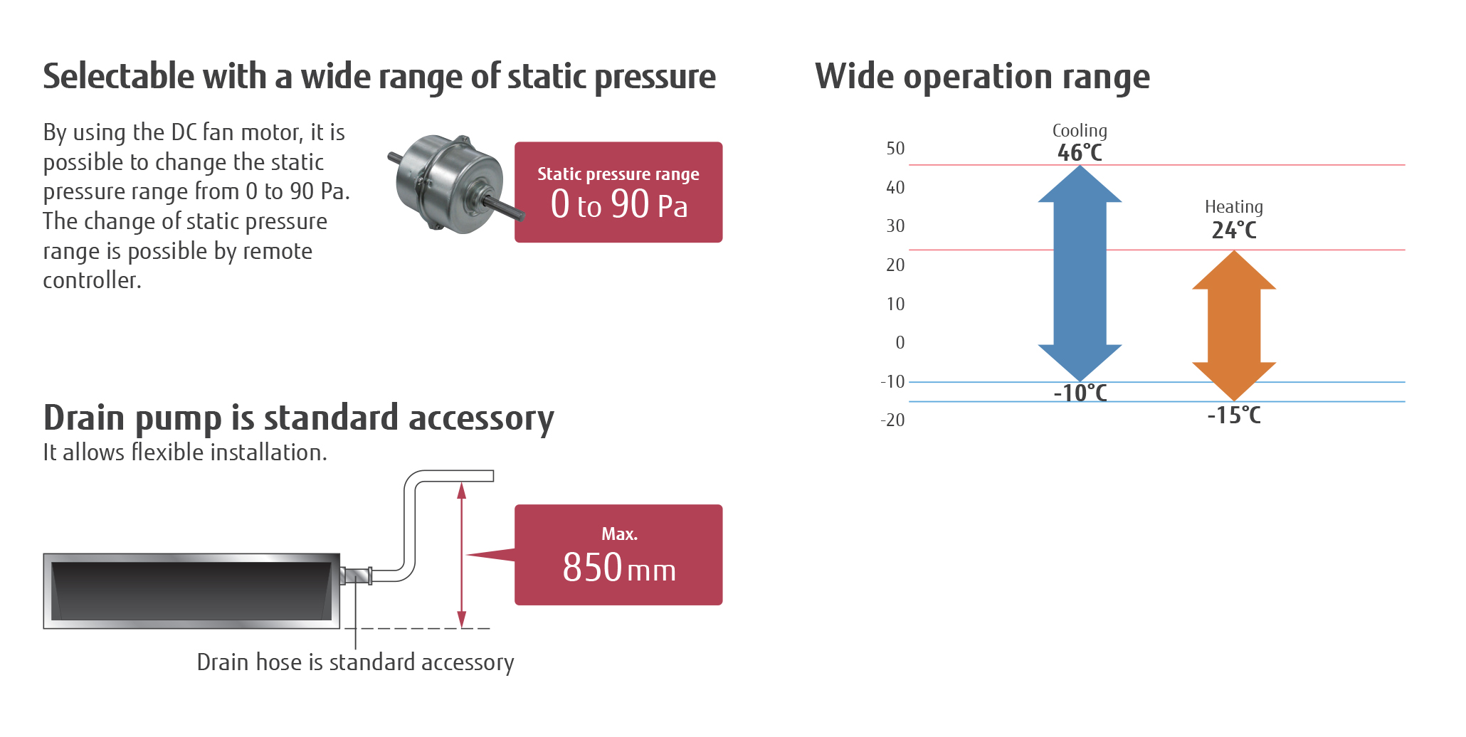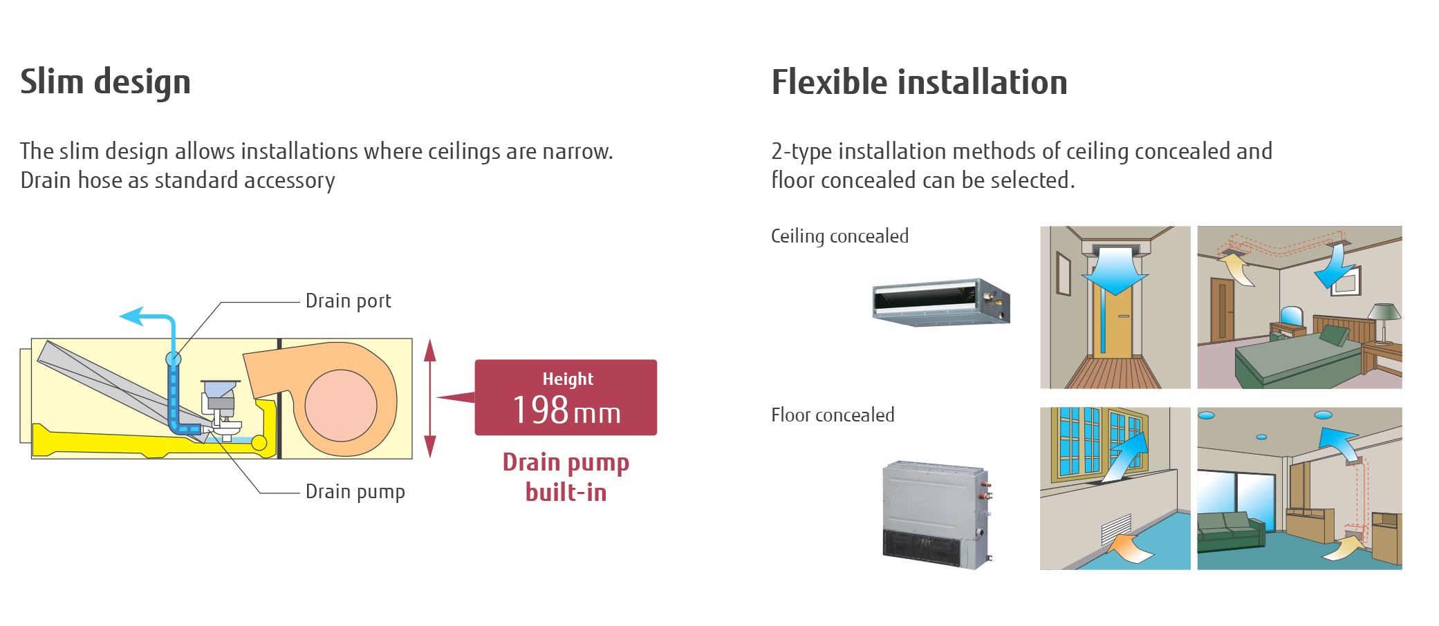 Dàn lạnh giấu trần nối ống gió dạng mỏng, với kiểu dáng của dàn lạnh mảnh mai, nhỏ gọn chế độ hoạt động êm ái rất thích hợp cho việc lắp đặt ở những không gian trần thấp.